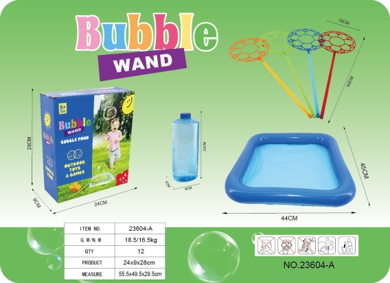 - 4 x ring do puszczania baniek, - butelka płynu do baniek, - dmuchany basenik na płyn do baniek. |