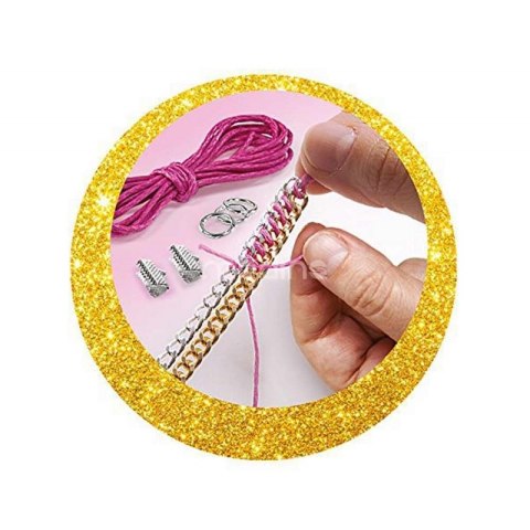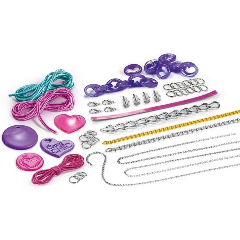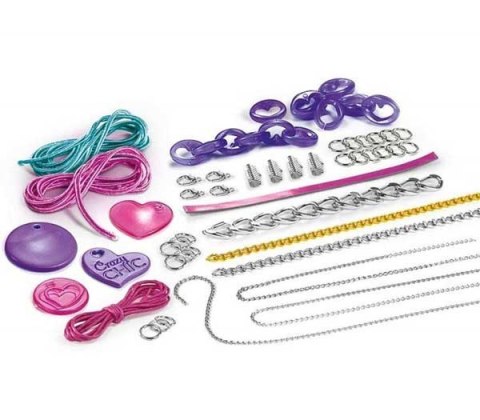 W zestawie znajdują się różne aluminiowe łańcuszki, plastikowe ogniwa do łączenia, kółeczka z metalicznym wykończeniem, opaska z ekoskóry, kolorowe rzemyki, metalowe zapięcia i końcówki, wisiorki z logo Crazy Chic oraz karty z ilustracjami.