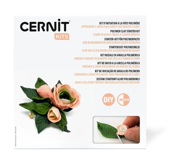 Zawartość: 4 kostki glinki polimerowej Cernit® w odpowiednich kolorach (po 25 g każda), 1 baza do broszki, 1 szpilka, 1 ostrze do modeliny, ulotka krok po kroku z instrukcjami.