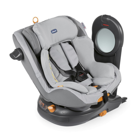 Regulowane, wbudowane lusterko pozwala na kontakt wzrokowy dziecka z rodzicem gdy fotelik zamontowany jest tyłem do kierunku jazdy.